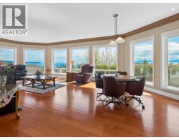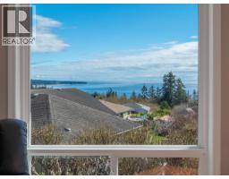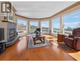Set on a private landscaped .31 acre lot, this stunning nearly 4,000 square ft residence offers breathtaking ocean and mountain views through expansive windows that fill the home with natural light. Designed for luxury living, the open-concept main level features rich Brazilian oak floors, elegant crown mouldings, and a timeless kitchen with cherry cabinetry, granite countertops, and a large island perfect for gathering and entertaining. French doors lead to a spacious view deck, ideal for hosting or relaxing. The impressive primary suite offers a spa-inspired retreat with a generous walk-in shower, walk-in closet, and convenient in-suite laundry. A large flex room on the main provides versatility as an office or bedroom, completing this exceptional home, a wide staircase leads down to the walk-out basement which includes three bedrooms, a full bath, rec. room, workshop, laundry, and opens to a generous patio. Laundry on both floors. (id:58554)