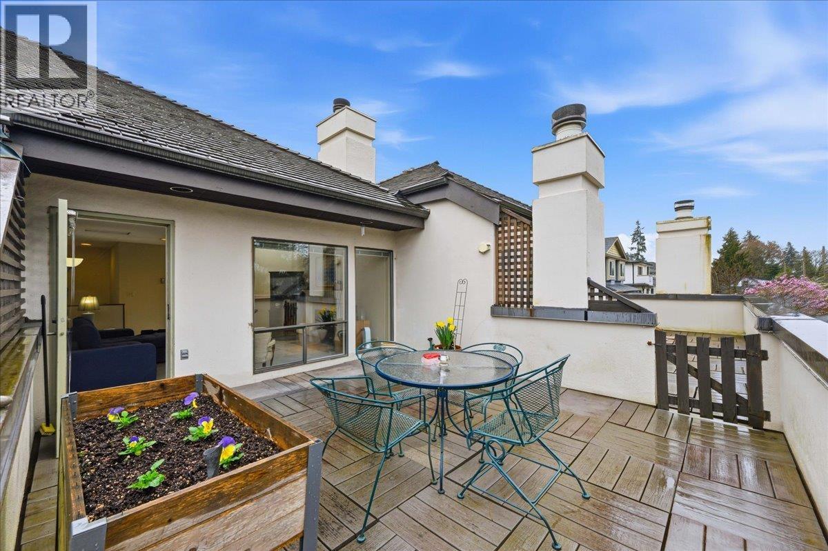 Sun-filled two-bedroom plus den townhome situated in a highly convenient Kerrisdale location. This unique residence features a reverse floor plan, with an inviting bright, skylit living room, dining area, kitchen & powder room, creating an open and airy living space on the upper level. The first level offers two bedrooms, a den/solarium & a full bathroom. Enjoy beautiful southern views from the expansive patio off the living room. Ideally located within walking distance to the shops and amenities of Kerrisdale Village & Elm Park. Convenient access to public transit, including the express bus to University of British Columbia right out of the front door! Close proximity to Kerrisdale Elementary School and Crofton House School. Includes 1 parking stall & 1 storage locker. Open House April 11, 2-4pm. (id:58554)
