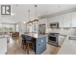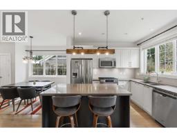 MODERN FINISHINGS, EVERYDAY CONVENIENCE, AND PEACEFUL TRANQUILITY! Gorgeous half duplex-style 3 bedroom, 2.5 bath townhome of approximately 1300 sqft in sought-after Village Green, backing onto treed space and agricultural ALR land. Fantastic main floor layout features a bright, gourmet shaker-style kitchen with ample cabinetry and quartz countertops, complete with island and stainless appliances. Spacious living rm with bonus free-standing gas fireplace for cozy evenings. 3 bdrms up incl spa-inspired primary with large windows and full ensuite. EV TESLA CHARGER INSTALLED! Enjoy treed views from the kitchen or while relaxing in the fenced yard or on the large west-facing patio with gas BBQ hook-up. Single car garage plus driveway. Close to schools, shopping, and transportation! THE COMPLETE PACKAGE (id:58554)