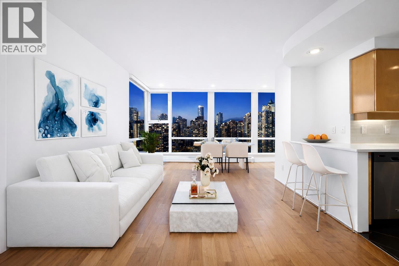 Elevated living in the heart of Yaletown at the popular Waterworks building. Positioned on the high 28th floor, this bright 743 Sq. Ft. 1 bedroom home enjoys a one of a kind panoramic city skyline view, partial water views, and bright natural light with no buildings directly in front, offering excellent privacy. Freshly updated and move in ready, the home has been painted throughout including walls, doors, trims, ceiling, closet doors, and heated panels. Walnut hardwood floors warm the living area, while the kitchen features brand new appliances. Just steps to the Seawall, SkyTrain, restaurants, cafes, and groceries. Residents enjoy an indoor pool, hot tub, steam room, fitness centre, 24/7 concierge, and lounge areas. A premium turnkey Yaletown opportunity! (id:58554)