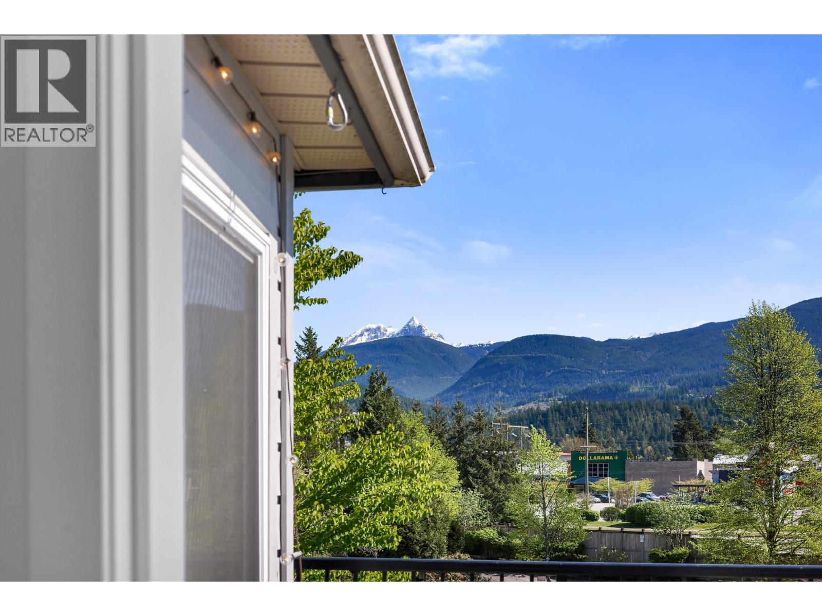 Bright top-floor corner jr. 2 bedroom (skylight, no window) apartment in central Squamish with stunning views of Diamond Head! This home features a bright, open layout with multi skylights and a sunny patio perfect for apres. Renovated 2017 with a custom kitchen and GE appliances, plus updated flooring throughout. The dining area offers built-in bench seating with storage, while an electric fireplace, rustic shelving and updated lighting create a warm, inviting feel. The second bed / den incl. LG front-load washer/dryer and built-in bike storage for multiple bikes and loads of gear. Could easily be a nursery or home office (skylight, no window). Home incl. covered parking, storage locker, ski locker, in a well-maintained strata with new windows, paint, decks, more! Perfect for FTB! (id:58554)