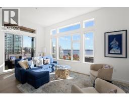 Introducing this TOP FLOOR PENTHOUSE 2 bed + office SE CORNER home with stunning views throughout. A true downsizers dream with 12' CEILINGS and over 1200 sqft in a modern, open-concept layout. Features 2 separated bedrooms, both with ensuites, a spacious walk-in closet in the primary, and views from every room. Enjoy a dedicated laundry nook with storage, large kitchen island with built-in wine fridge, and ample space for living and entertaining. Stay comfortable year-round with AIR CONDITIONING. This penthouse offers radiant hardwood floors, a gourmet kitchen with stainless steel appliances, 5-burner gar range, and quartz countertops. Includes 2 side-by-side parking and a private storage room. Set in a prime location where you are steps to the very best of Lower Lonsdale living! (id:58554)